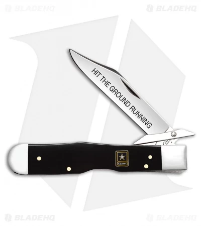 The Case U.S. Army Cheetha pocket knife is a sturdy, reliable tool that any service member can depend on. The Tru-Sharp surgical stainless steel blade with nail nick opening is laser engraved with “Hit The Ground Running”. Black synthetic scales are lightweight and durable with a full color U.S. Army Star graphic. Polished nickel silver bolsters with pinned brass liners for a tool ready for years of use.