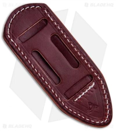 The Delta Sheath Shield Mini is a premium leather sheath. This one has a burgundy color. It’s compact, and fits an assortment of fixed blade knives nicely. It attaches to a belt either vertically (1.75″ maximum) and horizontally (1.5″ maximum).