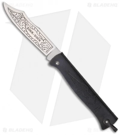 The Douk-Douk pocket knife is a minimalist folder design that’s been in use for over 70 years and famous in the former French colonies. The folded black finished steel handle has a slip-joint mechanism and bail loop for lanyard. Carbon steel blade with scroll etching and handle features Douk-Douk artwork.