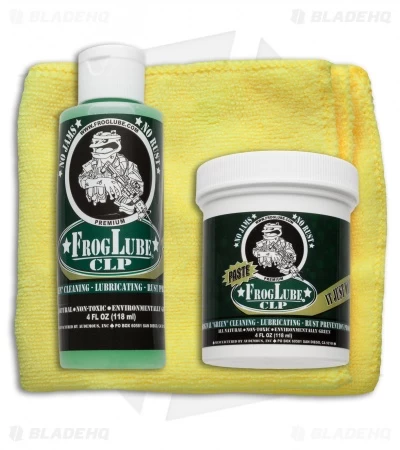 The FrogLube 4 oz. Cleaner Kit includes a 4 oz. bottle of FrogLube CLP, 4 oz. container of FrogLube CLP Paste, cleaning brush, and buffing cloth.