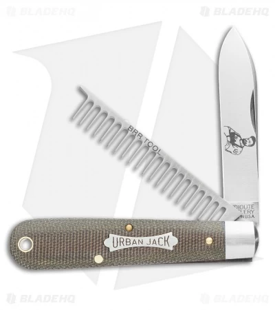 This Tidioute Cutlery Urban Jack features a drop-point blade and a sturdy steel hair comb. The handle is fitted with beautiful green micarta scales and a nickel silver bolster.