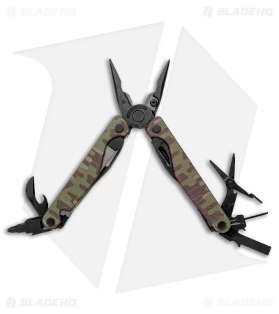 The Leatherman Charge Plus multi-tool is packed with 18 tools, including interchangeable wire cutters, drivers and 8 bits. The Charge Plus has stainless steel construction with hard anodized woodland camo 6061-T6 aluminum handle scales. It features a 2.9″ 154CM stainless steel blade with a plain cutting edge and a 2.9″ 420HC steel blade with a fully serrated edge and an integrated guthook. All blades and tools are locking. The Charge Plus multi tool includes removable pocket clip and a premium nylon sheath.
