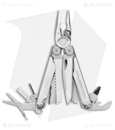 The Wave features: stainless steel handles and body; outside-accessible blades for one-handed opening; all locking blades and tools; fixed lanyard ring; nylon sheath; 25-year warranty.