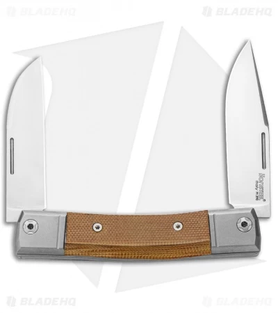 This model of the LionSteel BestMan has both a clip point and wharncliffe blade. The handle has natural micarta inserts with titanium bolsters.